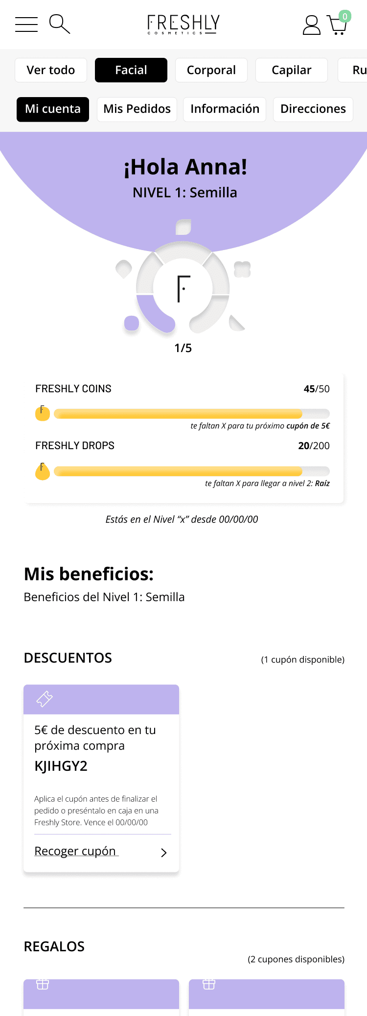 · Rediseñamos la página de área de cliente ya que tal y como estaba cuando te logueabas te llevaba directamente al Freshly Club sin darte nada de contexto. Además el menú del area de cliente se canibalizaba con el propio menú de la web que te lleva a las diferentes categorías.